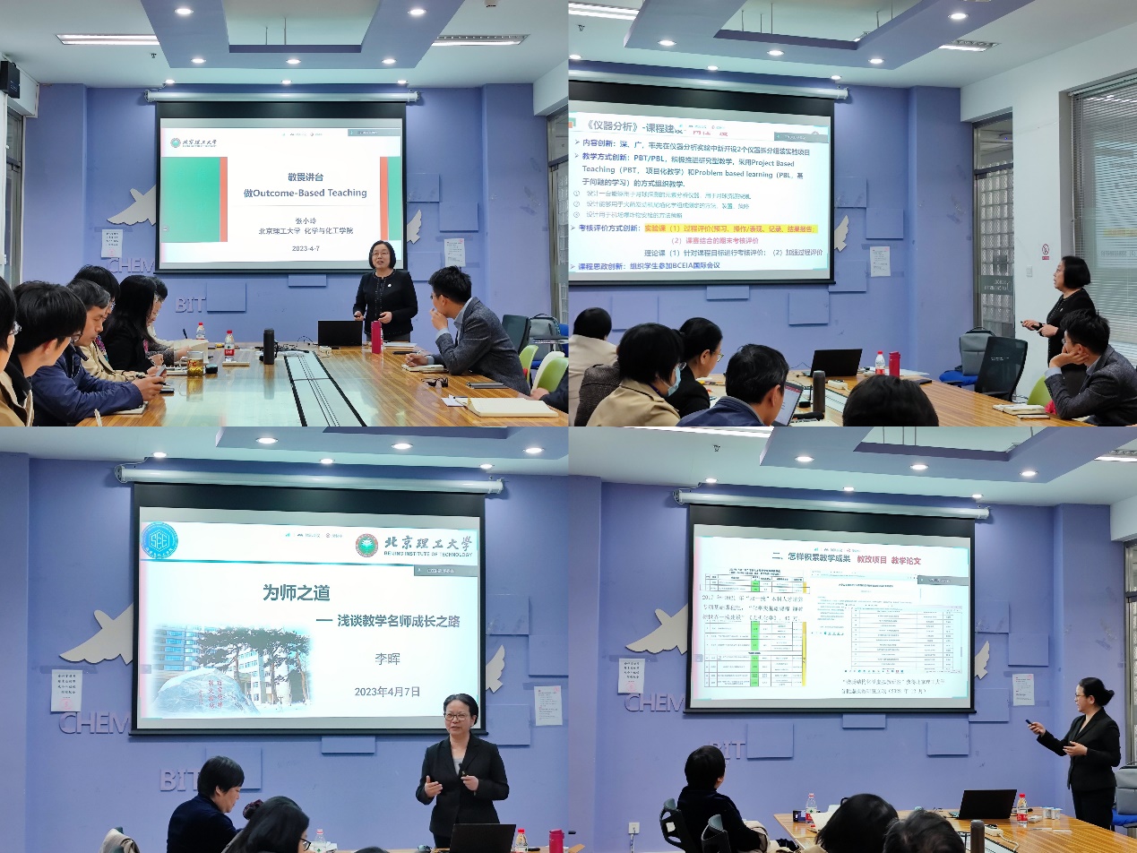 首先张小玲老师进行了题为《敬畏讲台——做Outcome-Based Teaching》的主题汇报,分享了分析化学课堂教学心得,并结合自身经历介绍了教改项目、教学成果奖申报的要求和注意事项。李晖老师的报告题目为《为师之道——浅谈教学名师成长之路》,从名师项目申报出发,以教学成果的积累为主轴,以如何成为好老师的感悟为思考,告诫青年教师应育德于教、育情于教。随后,两位老师与在座教师开展了交流讨论。