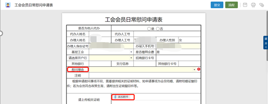 4.打开新页面,出现“工会会员日常慰问申请表”,在下拉项中选择慰问理由,并上传相应附件:会员结婚请上传“结婚证复印件”;会员符合政策生育请上传“孩子出生证明复印件”;患病住院手术请上传“诊断证明书或者手术记录”;会员父或母去世、会员配偶或子女去世以及会员本人去世,请上传“死亡证明或销户证明”(本项也可以用简短文字描述出生日期、离世时间等基本信息替代死亡或销户证明)。