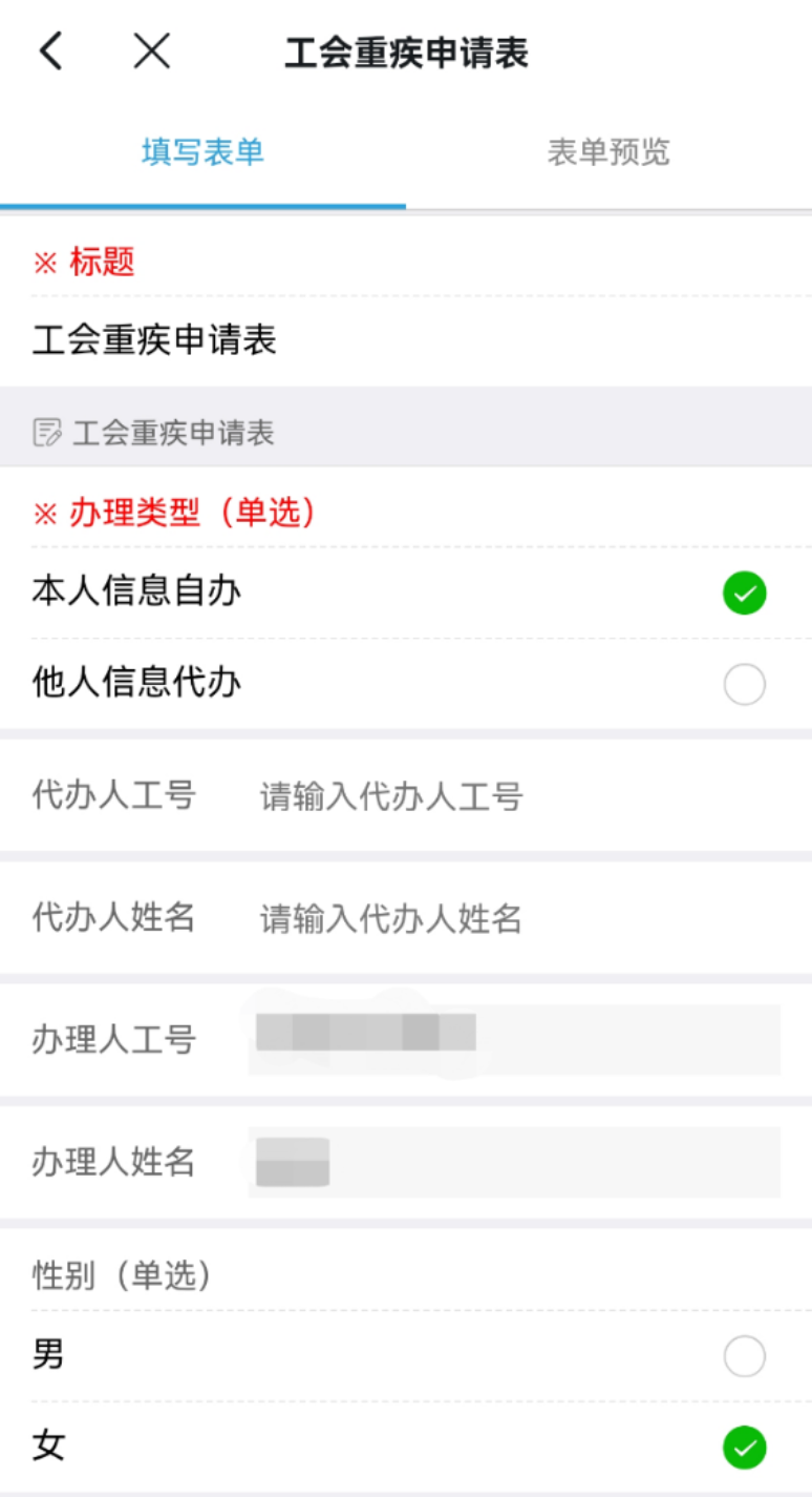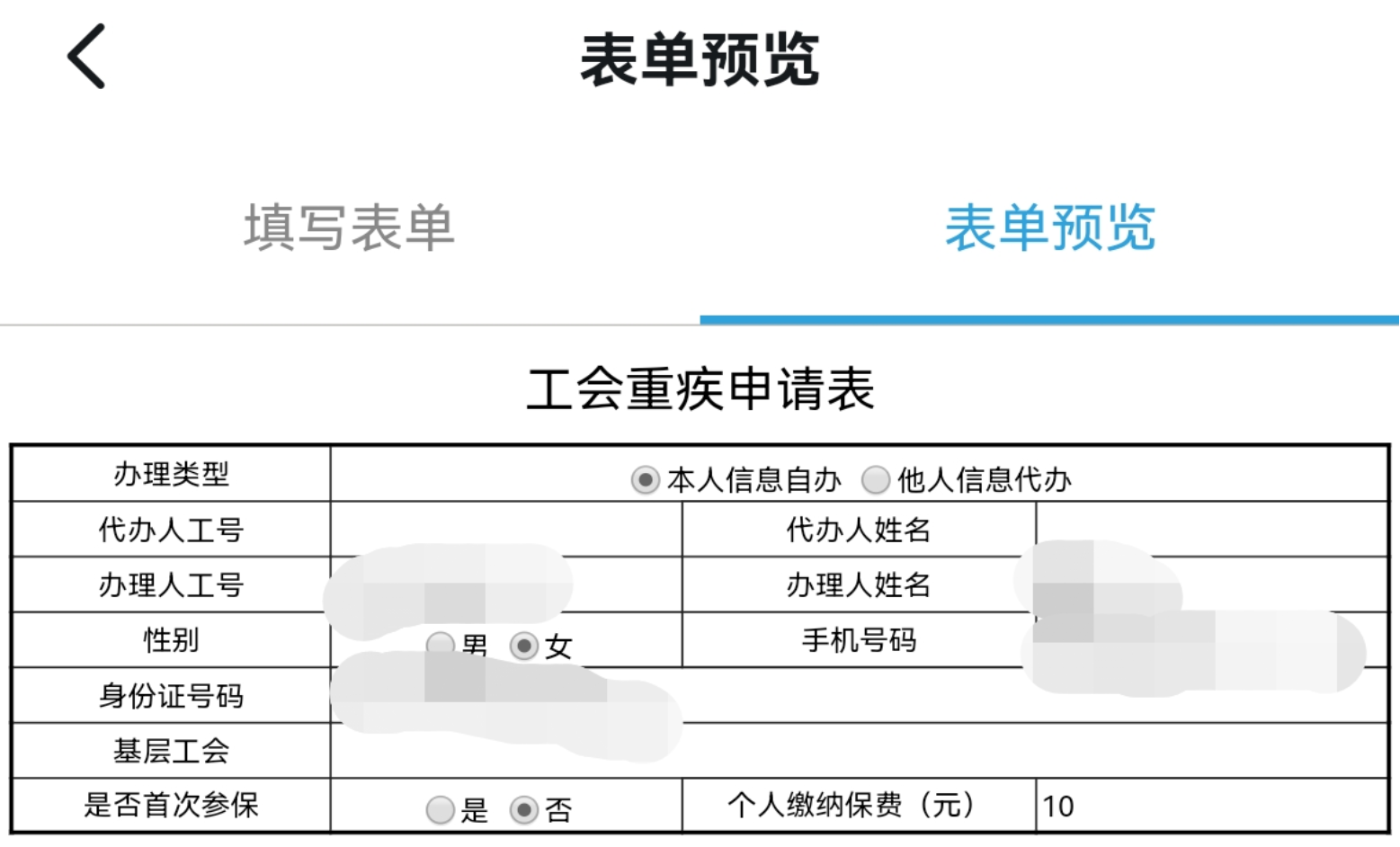 2.在“公共服务”部分选择您要办理的事务类型,我们以“在职职工重大疾病互助保障险申请”为例来示范。点击“会员重疾险申请表”,依次根据要求据实填写。
