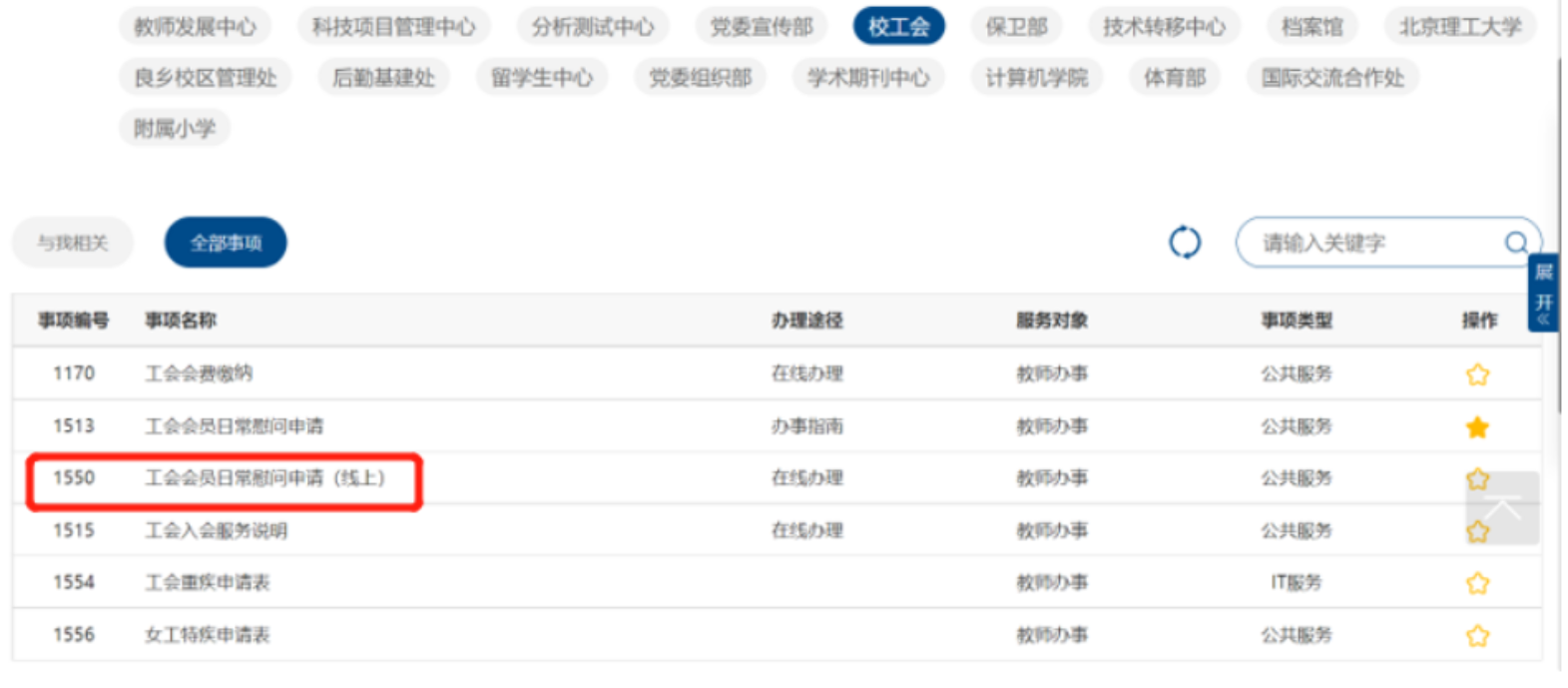 3.在“事项名称”列选择您要办理的事项,我们以“工会会员日常慰问申请(线上)”为例来示范。点击“工会会员日常慰问申请(线上)”